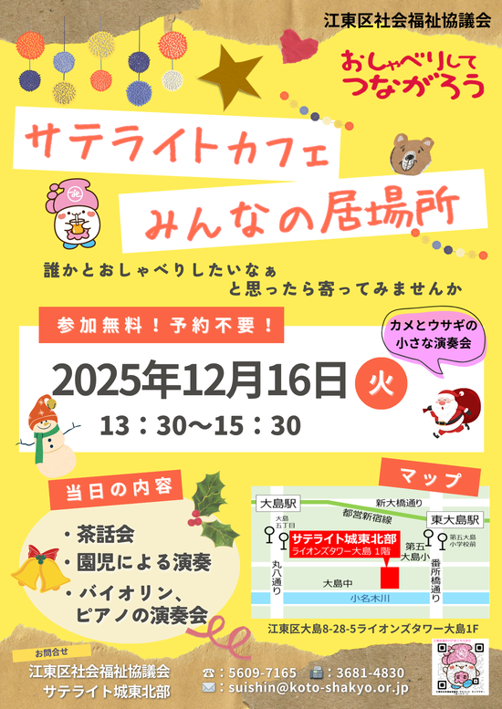 12月のサテライトカフェ「みんなの居場所」を開催いたします。12月は冬・クリスマスということもあり、近隣園から園児が演奏に来て、鍵盤ハーモニカを奏でてくれます。また、ボランティア団体さんをお呼びして、バイオリンとピアノのクリスマスのメロディーを奏でる「カメとウサギの小さな演奏会」を予定しております。その他、みんなでおしゃべりやクリスマスの雰囲気も楽しもうと思っております!
