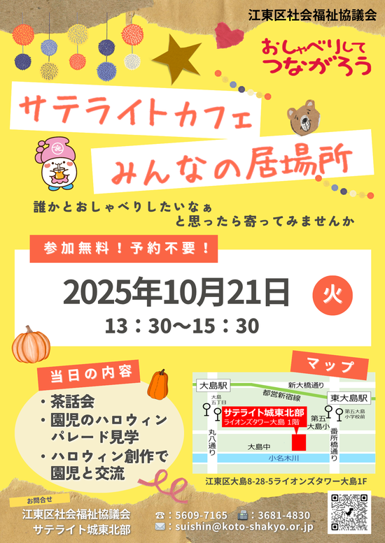 10月のサテライトカフェ「みんなの居場所」を開催いたします。10月は秋・ハロウィンということもあり、近隣園から園児がパレードに来て、一緒にハロウィン創作を行います。その他、みんなでおしゃべりや交流を楽しみましょう!予約不要・無料ですのでどなたでもお気軽にご参加ください。