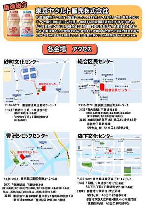 ■イベント今回は「おなか元気教室 ~腸を丈夫に『健”腸”長寿』~」 東京ヤクルト販売(株)の講師が、「健康長寿」の秘訣をアドバイス。おなかの仕組みを学んで、元気なからだを作りましょう。