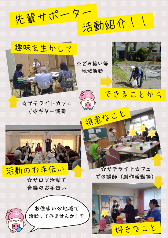 その他、地域のサロン活動を活性化するお手伝いや、特技や趣味を生かした活動の場もございます。ぜひこの機会にご応募お待ちしております!