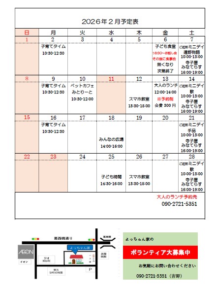 砂町よっちゃん家 1月のお知らせ1月のよっちゃん家カレンダーをお知らせします。あわせて、2月の月間予定もご覧ください。