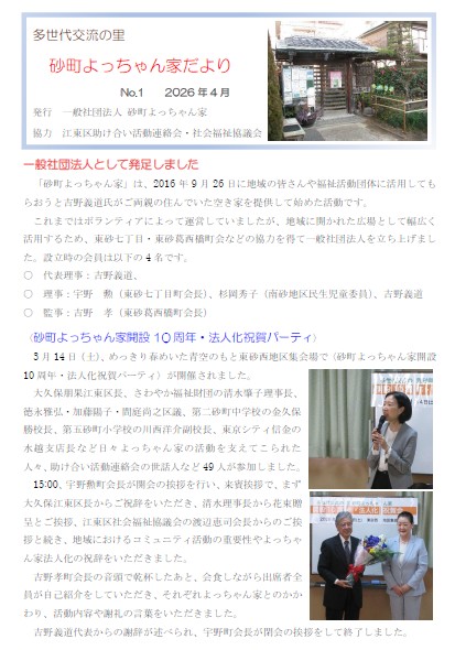 砂町よっちゃん家 4月のお知らせ4月の砂町よっちゃん家だよりをお知らせします。あわせて、4月の月間予定もご覧ください。
