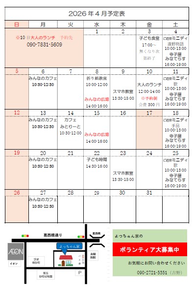 ホーム > 地域福祉推進課 > 地域福祉活動支援事業 砂町よっちゃん家4月のお知らせ