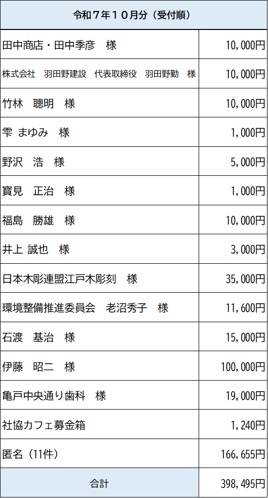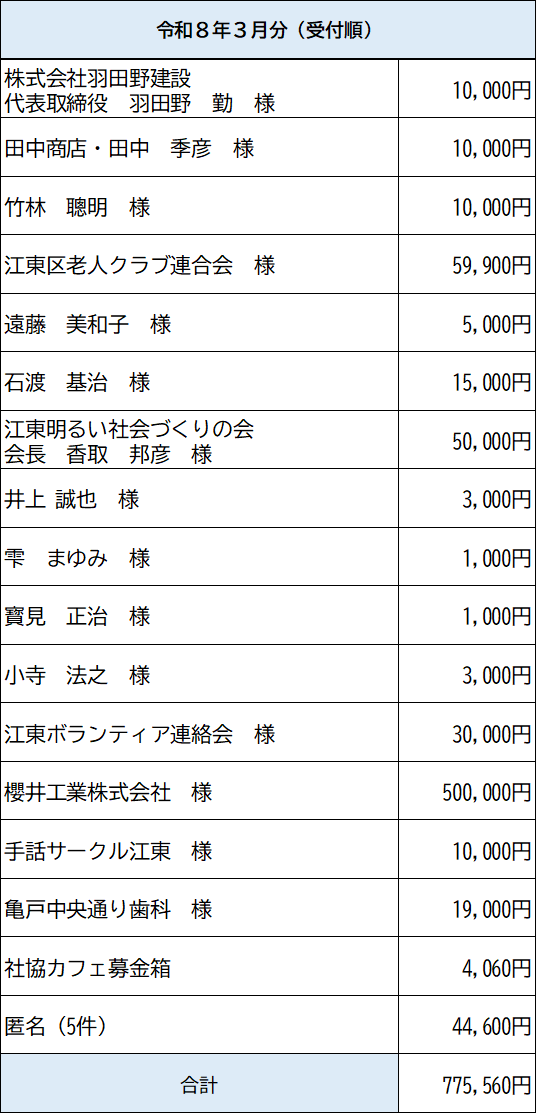 江東区社会福祉協議会では、多様化、複雑化している地域課題の解決に向け、地域福祉推進のための財源として、 寄付を受け付け、ご報告しています。